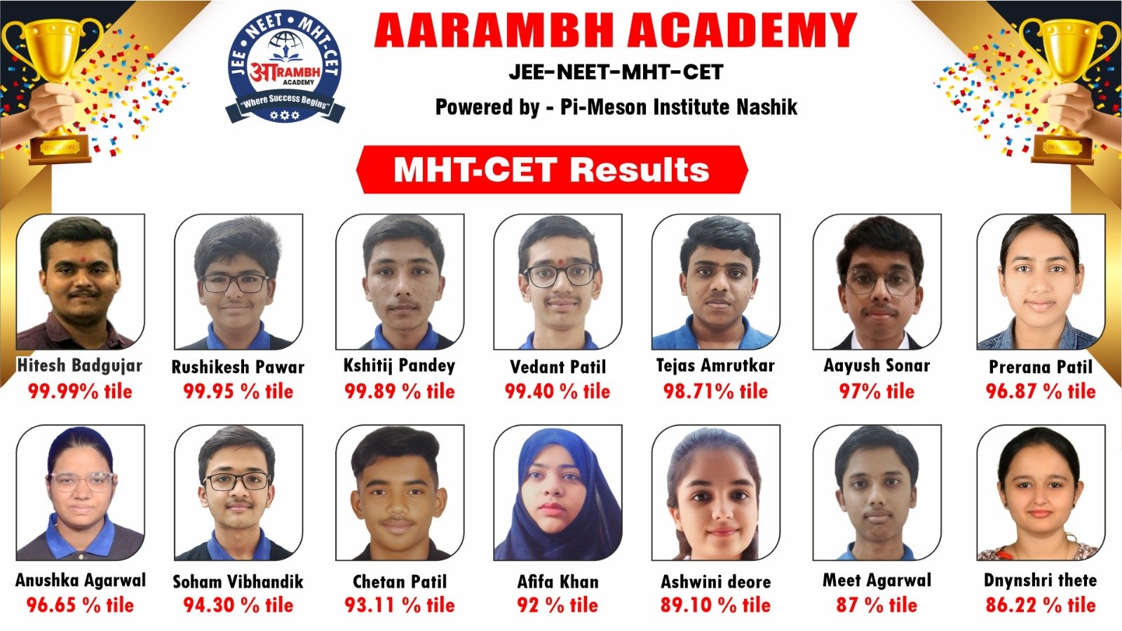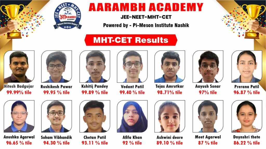 Aarambh Academy has a strong track record with students scoring up to 99.5 percentile in MHT-CET, and every year multiple students crossing 90+ percentile, making us a trusted MHT-CET coaching institute in Dhule.